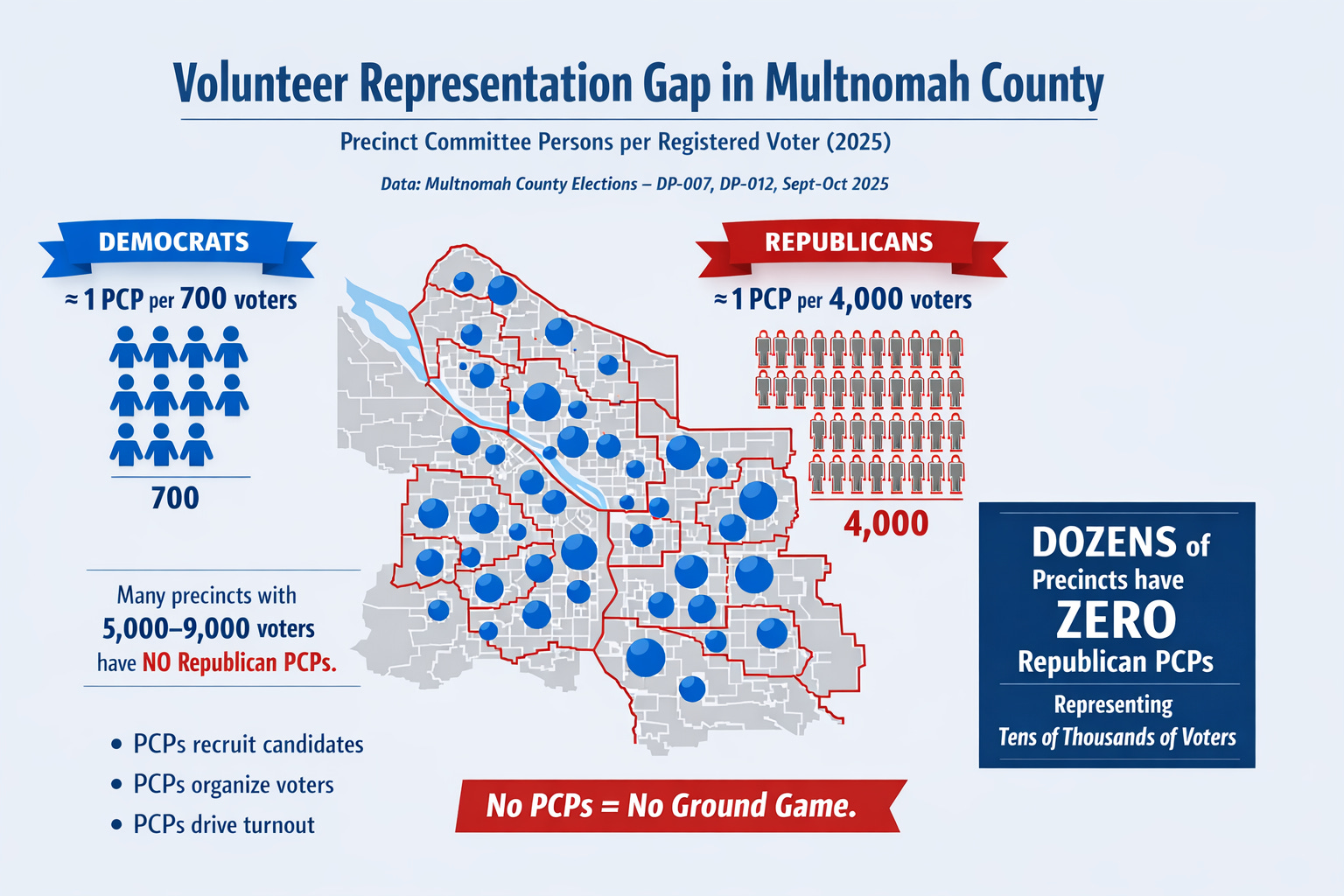 In many Portland precincts with 5,000 to 9,000 registered voters, there are zero Republican Precinct Committee Persons. Zero. No bench. No volunteer infrastructure. No trained observers. No trusted local teams.